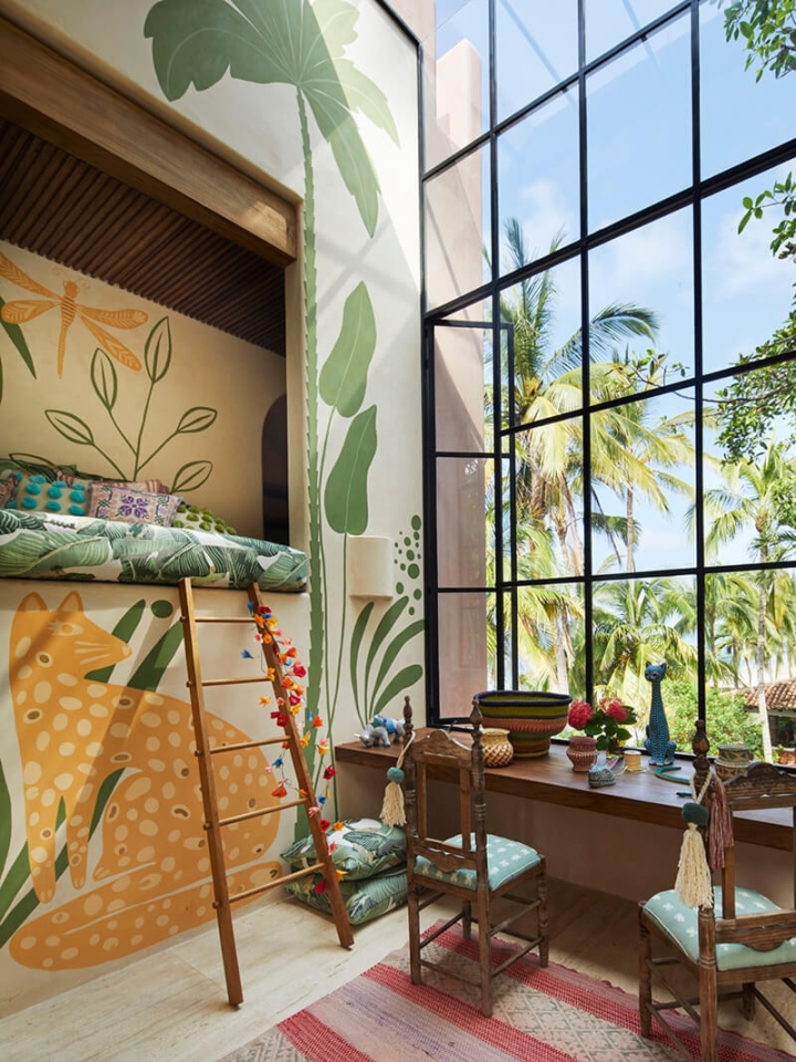 2、主卧阳台向外探出,把城市天际线框成画。3、餐厅阳台垂挂绿藤,油烟被藤蔓温柔过滤。4、玄关阳台藏了镜面,让四米空间在视觉上无限延展。